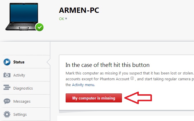 Կարգավորումների փուլը այսքանով ավարտվում է: Հետագայում եթե համակարգիչը գողանում են, անհրաժեշտ է մտնել այստեղ և սեղմել My computer is missing կոճակը: